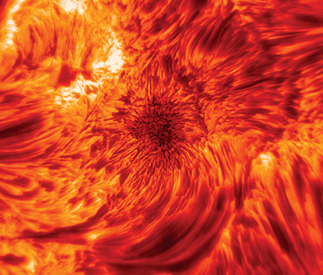 受到大量磁场线的推动,炽热的电浆(plasma)喷流从一处小太阳黑子升腾而起,该太阳黑子的面积差不多等于中国的国土面积