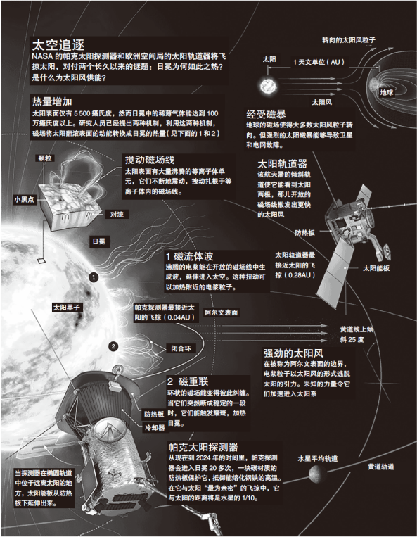 假如一切进展得顺利,探测器――安全地处在防热板的阴影里――会发送回日冕电浆以及塑造出日冕的紊乱磁场网络的记录。那些数据能解开若干基础性的谜团。比如说,是什么东西将电浆加热到太阳表面温度的200倍以上?太阳风(电浆粒子流)又是如何逃逸到太空的?自从太阳物理学家尤金·帕克(EugeneParker,这次的太阳探测器以他的姓氏命名)在1958年描述了太阳风起,太阳风一直是个谜团。更好地理解太阳风能帮助现今的研究者改善他们对太阳磁暴的预测。太阳磁暴是强烈爆发的太阳风,会撞击地球磁场,最强烈的时候能破坏卫星和电网。