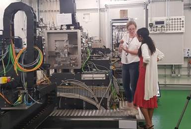 光束线站科学家帕克向《物理世界》编辑安娜·德明(AnnaDemming)展示了纳米探针光束线站I14的实验站