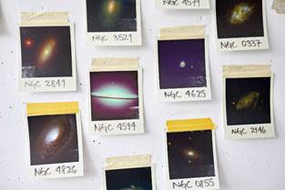 马克斯·普朗克研究所的一面墙上张贴着各类星系的照片,其中有些星系的名字很有特色,比如左下角的黑眼星系或者左二的草帽星系(NGC4594)