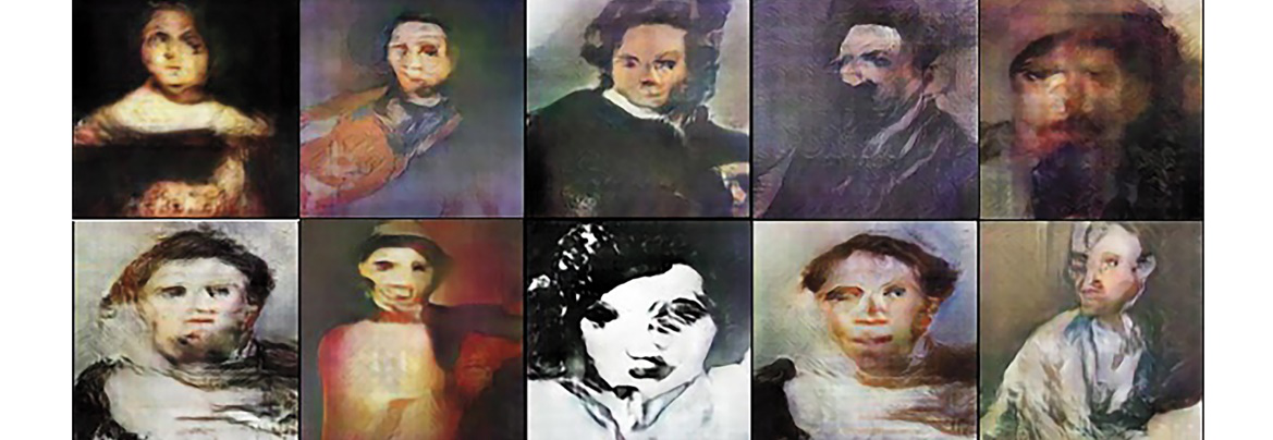 这组肖像是生成对抗网络算法产生的。算法将过去500年艺术史上不同风格的肖像画用于训练。画面上扭曲的脸是因为算法尝试要模拟这些不同的风格的肖像而不得导致的