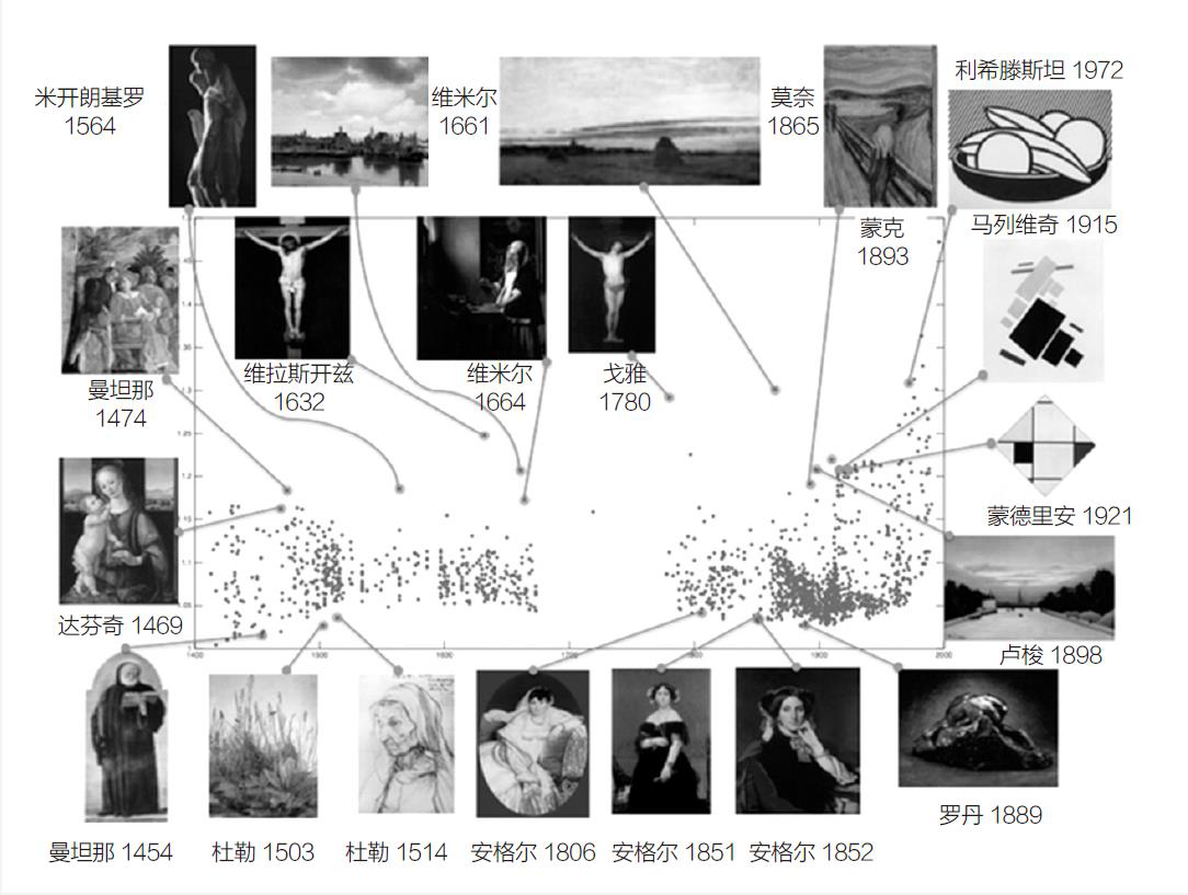 将不同的数据表征可视化后,可以发现有些特定的艺术家总是被机器选为其所在艺术风格的独特代表,因为他们的数据点是相关艺术类型所在的维度的极值点。