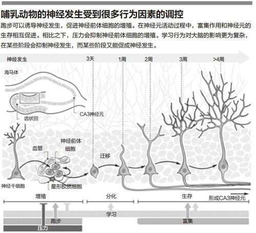 神经发生通过神经干细胞和神经前体细胞分裂形成,这些神经前体细胞迁移后发育成神经元。曾认为这一过程只发生于胚胎发育阶段,因此出生后就不会产生新的神经元。出乎意料的是,研究人员发现很多哺乳动物在整个生命过程中,脑部特定区域会有新神经细胞形成,尤其是海马体,它是与记忆密切相关的脑区。