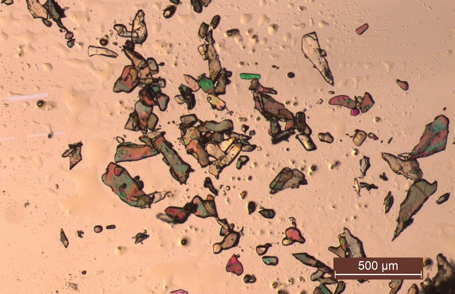 当暴露于偏振光时,乙醛苯腙晶体在显微镜下看起来是彩色的