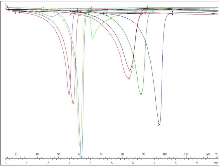 特里·思雷福尔及同事证实,APH晶体存在低熔点型和高熔点型。y轴表示晶体熔化时吸收的热量;曲线下的面积则表示测量到的吸热