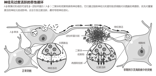 近期,在众多复杂的AD发病机制中,科学家发现选择性神经元过度活跃而产生毒性的过程,也就是这个微观精细电路调控过程影响认知损伤。实验室和临床研究越来越支持异常神经元激活在致病方面的重要影响力,包括部分AD患者发生癫痫。前驱(早期症状)AD人群的功能性磁共振成像(fMRI)展示了海马体和大脑皮层神经元的过度活动,这两处均为Aβ大量积累的地方。有关AD样Aβ沉积转基因小鼠模型的超兴奋性的分子基础研究表明了Aβ可溶性形态的关键作用,而Aβ可溶性形态与不溶性Aβ纤维沉积(淀粉样斑块)处在一个复杂的平衡中。