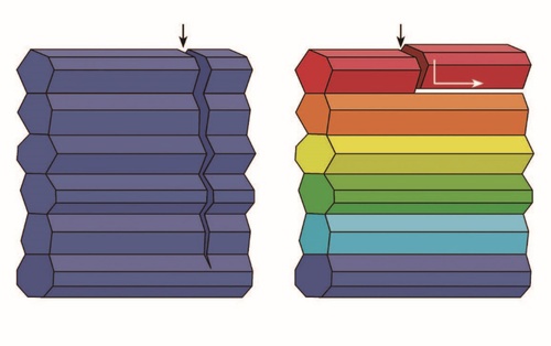 彼此沿长轴平行排列的晶粒(左)和存在微小取向差的晶粒(右)。该示意图显示了裂纹如何在互相平行的晶粒间传播,又如何在存在取向差的晶粒(如人类牙釉质中磷灰石晶体的晶粒)间偏转