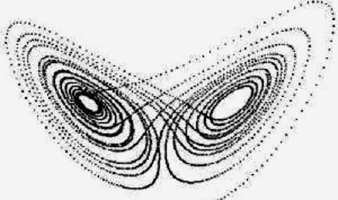 “蝴蝶效应”对于天气预报来说似乎是灾难性的,但是洛伦兹却感受到了受偶然性和复杂性支配的大气混沌运动的内在魅力。“蝴蝶效应”为洛伦兹刻画随机、非周期运动提供了线索。洛伦兹用具有三个变量的三个方程组描述这种系统的运动。如果把计算机打印出来的每一组三个数字作为三维空间中的坐标,对应相空间中的一个点,那么,这些数字的变化会描绘出相空间中的一条曲线,这是系统的运动在相空间中的“轨道”,因为运动是非周期性的,这些曲线是不会重合的。
