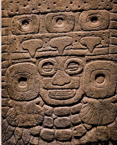 图片是一块发现于蒂卡尔的石碑,体现了特奥蒂瓦坎多用几何线条的艺术风格,上面绘制的是掷矛者猫头鹰的肖像,他可能是特奥蒂瓦坎的一位国王