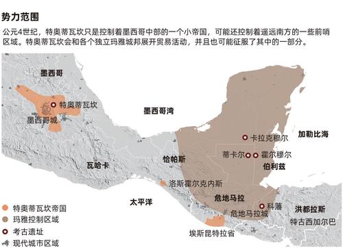 史密斯说,特奥蒂瓦坎在墨西哥中部肯定只控制了一小块区域。例如,在特奥蒂瓦坎以南85公里处的现墨西哥莫雷洛斯州,他在各个小镇都发现了大量具有特奥蒂瓦坎风格的陶器,还发现城市鼎盛时期的黑曜石。不过,在更远一些的地方,特奥蒂瓦坎帝国的控制力就各不相同了。“特奥蒂瓦坎对自己控制的地区持因城施策的态度。”加州州立理工大学波莫纳分校考古学家克劳迪亚 • 劳里尔斯(Claudia García-Des Lauriers)如是说。她发掘了现墨西哥恰帕斯州海岸上的洛斯霍尔克内斯遗址并绘制了地图。劳里尔斯称,这座古城中的重要金字塔和广场(公元400—600年)就像著名特奥蒂瓦坎月亮金字塔的小型版。洛斯霍尔克内斯坐落于贸易必经之地的狭窄山口,控制了它,特奥蒂瓦坎就能控制从郁郁葱葱的恰帕斯海岸运送过来的可可和绿咬鹃羽毛。