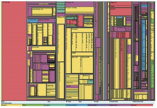 1991年,本 • 施耐德曼(Ben Shneiderman)制作了这张矩形树图,展示电 脑硬盘的分层嵌套文件夹结构。为了创造尽可能紧凑的可视化方案,他想出 了一条策略,在浏览硬盘的不同分层时,将屏幕分成水平方向和垂直方向交 替的各种矩形。他的递归排列算法变革了树状结构的现代可视化方案