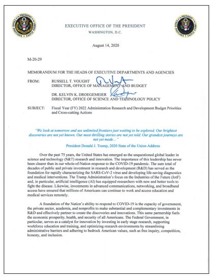 2020年8月14日,美国管理预算办公室(OMB)和科技政策办公室(OSTP)联合发布了《2022财年研发预算优先事项和全局行动备忘录》。