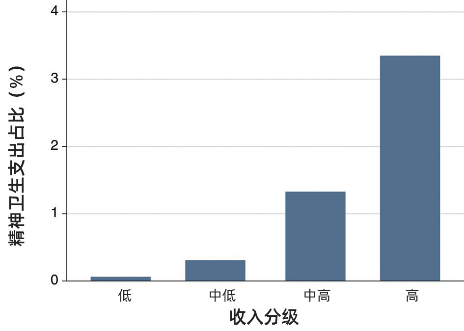 图2 国家收入分级情况下的精神卫生支出。世界银行设定的四级收入分组的国家精神卫生预算占卫生总预算的平均百分数。数据来源于2017年WHO精神卫生图谱,卫生总支出来源于WHO全球卫生支出数据库