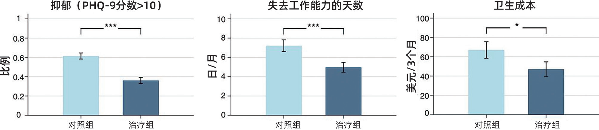图5 行为激活治疗对抑郁、劳动力供给和卫生成本的影响。3个月内治疗和对照组抑郁水平的均值(由PHQ-9分数>10者的比例作为评估指标)、失去工作能力的天数以及卫生成本(不包括干预的花费)。误差条标记了±1 SEM。星号标记了治疗和对照组在调整协变量后存在显著差异:*P<0.1;***P<0.01