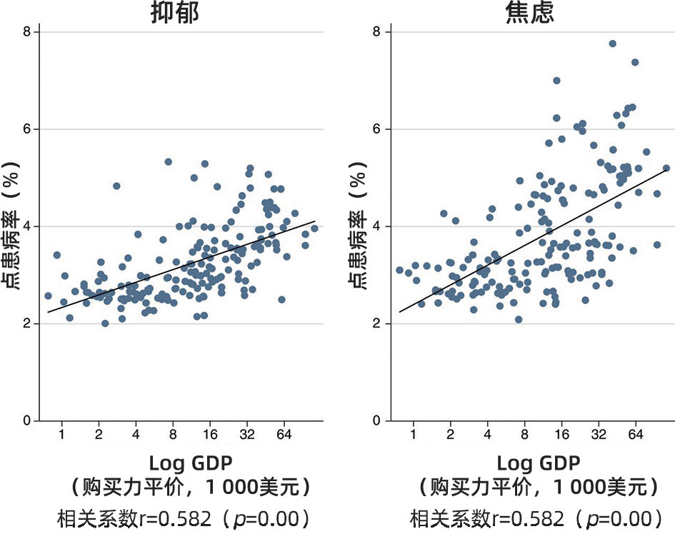 图6 各国常见精神疾病的患病率。上图展示了某一时间点各个国家预估罹患抑郁障碍(左)或焦虑障碍(右)的人数百分比和国家人均GDP以10为底的对数值之间的相关性。每一个散点代表一个国家。线条代表横纵坐标通过普通最小二乘法回归的结果。患病率数据来自2017年全球疾病负担研究。2017年人均GDP以当年国际美元汇率为标准,数据来自世界银行的世界发展指标相关数据集