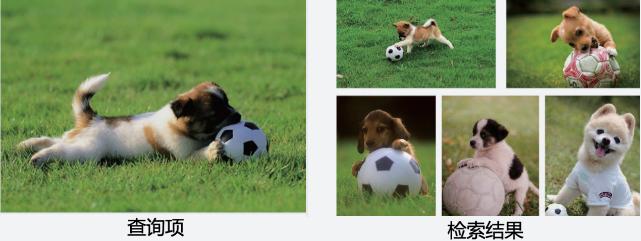 图1 图片到图片的检索示例。利用训练好的深度神经网络模型,可将数据集中每一幅图像实例进行特征计算,得到它的视觉特征向量。当查询开始时,用同样的深度神经网络模型,将查询图像即左图表示为一个视觉特征向量,即表征查询意愿的向量。计算该查询向量和数据集中每一幅图像的特征向量之间相似度,然后从大到小排序,就可以得到查询结果。右图给出了5幅最相似的图像
