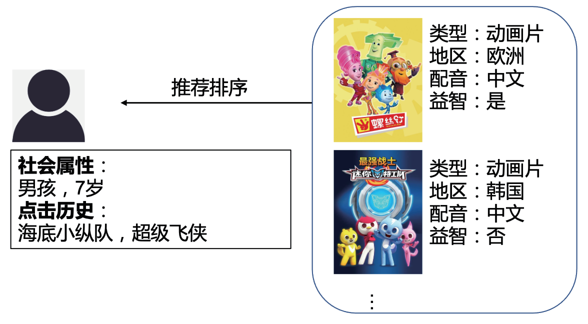 图3 推荐任务示例。推荐系统首先将用户的性别、年龄和行为等语义属性映射到向量空间,对用户画像形成一种向量表示;其次将商品的类型和地区等属性映射到向量空间;随后基于这些向量来计算用户和商品之间的匹配分值,根据匹配分值从高到低排序,产生推荐列表,如图3中右侧所示