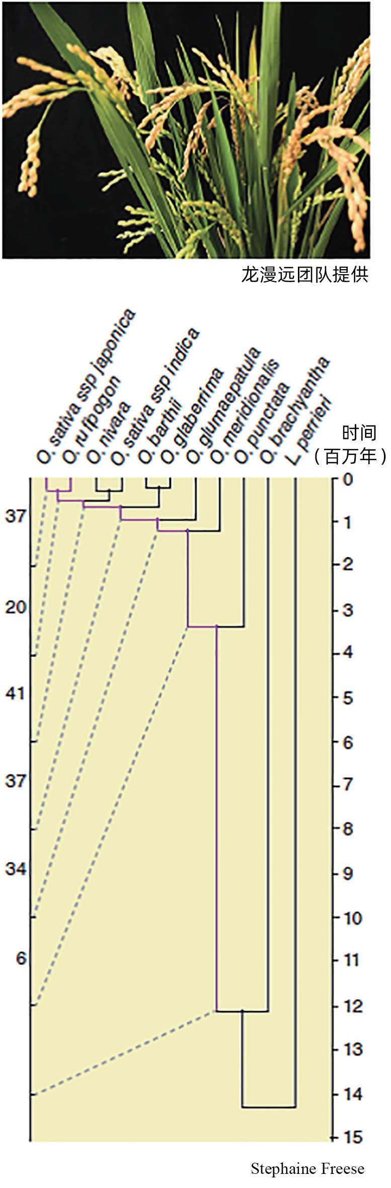 图4 通过水稻及其近缘物种的比较基因组学分析可以追溯从头起源新基因在稻属中的起源事件。实验用的水稻亚种粳稻(上)和相关物种都种植于中国海南。系统发生树(下)展示了从头起源新基因在栽培稻不同的祖先阶段随时间推移(右轴是物种分歧时间,以百万年计)而产生的数目(左轴是从头起源新基因的数目)