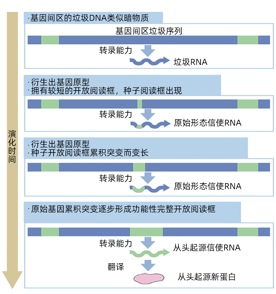 图8 在绝大多数从头起源新基因的诞生过程中, 一部分基因组中“垃圾DNA”持续转录出非编 码“垃圾RNA”。随着时间推移,突变在这些无 意义的序列中产生,使其在持续被转录的过程中 获得较短的开放阅读框,这个新产生的开放阅读 框随之被包括进了产生的信使RNA。当更多的突 变积累,形成更加完整的开放阅读框时,即产生 了功能性编码蛋白质的信使RNA
