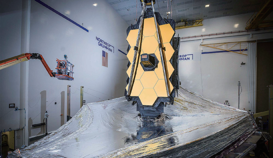 在诺斯罗普·格鲁曼位于加利福尼亚的工厂里,组装好的韦布望远镜耸立着。此时,它的主镜就处于折叠状态