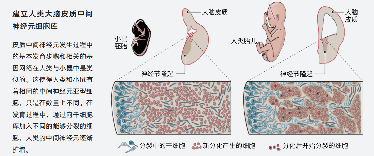 大脑皮质是人类大脑最大的组成部分,是人脑最大的信息处理中心,承担着脑的高级功能。中间神经元是大脑皮质两种主要的神经元之一。其数量随皮质体积的增加而增加,但人类的中间神经元的种类却与啮齿类动物相似。时颖超等人报道了人和小鼠指导中间神经元分化的十分保守的基因网络,解释了相同种类的中间神经元是如何在不同物种中出现的。梅赛德斯?帕雷德斯(Mercedes F. Paredes)等人发现中间神经元在胚胎脑部一种独特的细胞结构中发育,而且相比啮齿类动物,人类中间神经元的发育时间长得多。这也解释了中间神经元数量是如何增加的。这些研究帮助我们理解人类大脑皮质中间神经元的发育过程,并为人类疾病研究提供了基本的框架。