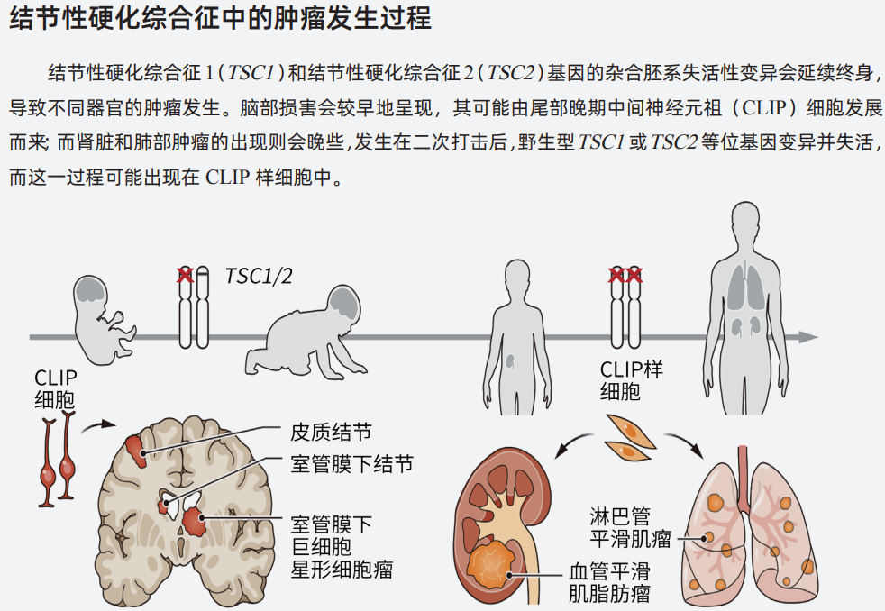 TSC由杂合胚系突变导致TSC1和TSC2基因失活引起,这些基因的蛋白质产物在正常情况下通过机械靶向作用负性调节雷帕霉素复合物1(mTORC1)。因此mTORC1抑制剂常用于治疗TSC脑、肺和肾脏肿瘤以及癫痫患者,但并不能治疗所有症状,而脑部肿瘤如何产生仍不明确。