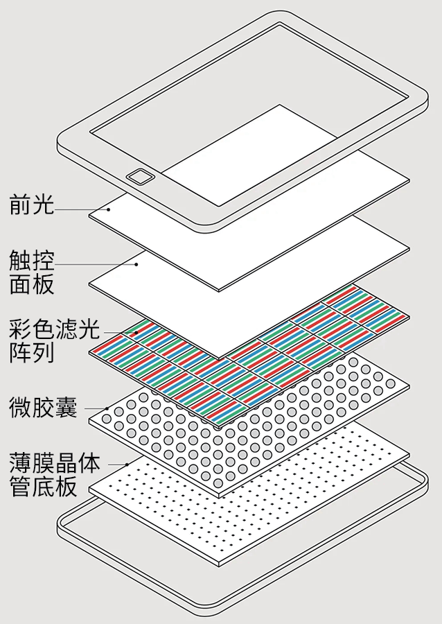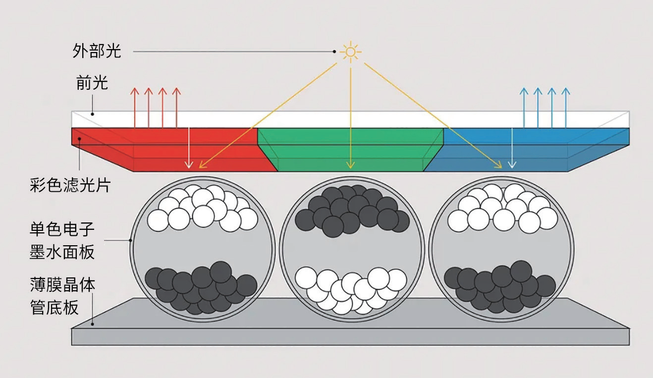 在电子墨水公司的Triton和Kaleido显示屏中,彩色滤光片将白色微粒反射的光变成红色、绿色和蓝色次像素。然而,这种方式降低了分辨率和亮度,限制了第一代彩色电子纸技术的普及