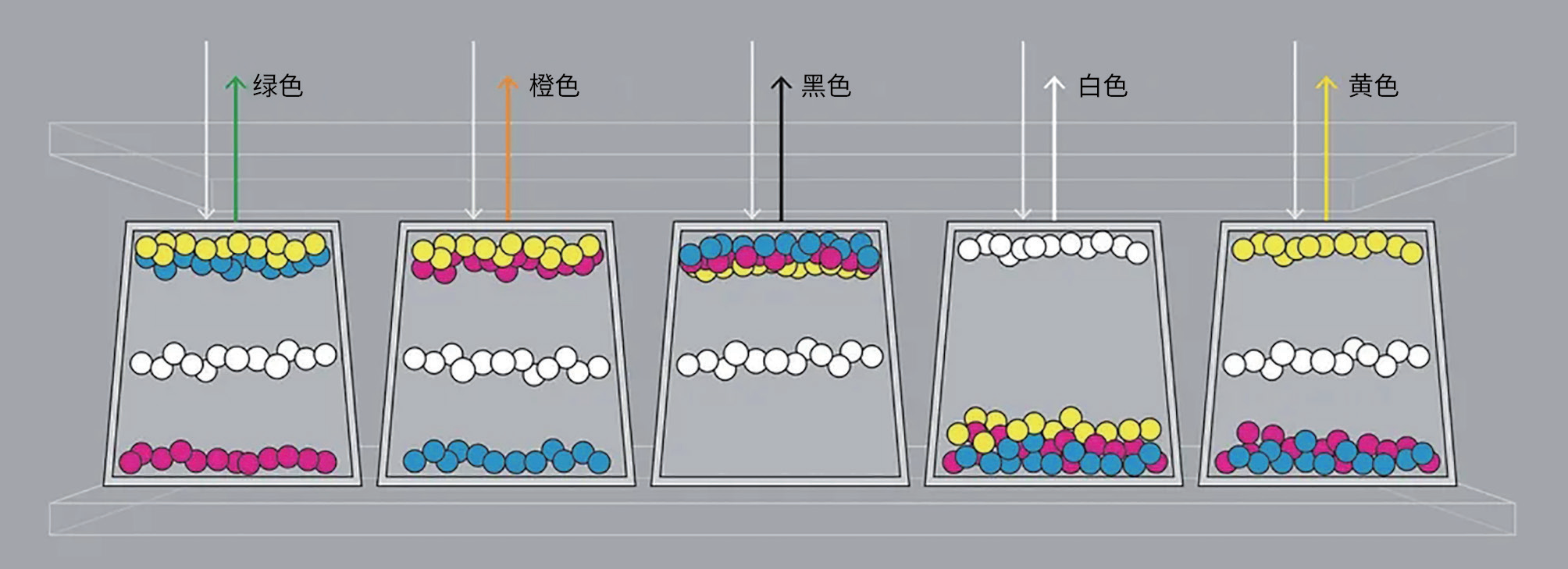 我们一旦将微粒分开,就得要施加波形。我们不单单是将一组微粒送入顶层,将另一组微粒送入底层,而是对它们既推又拉,生成图像。譬如说,我们可以将一种颜色的微粒推至顶层,再将它们稍稍拉回来,于是它们与其他微粒混合,生成特定的颜色。青色与黄色混合,生成绿色,而白色微粒提供反射背景。一种微粒更靠近表面,那个颜色在混合色中的色彩浓度也就更大。