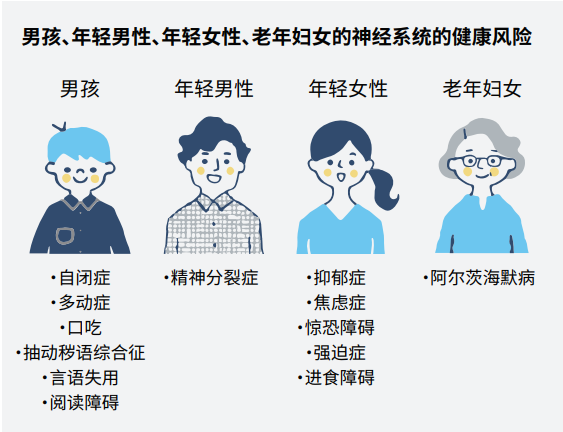 性别影响人的神经多样性和精神障碍发生率,并贯穿一生。男孩面对着多种神经发育问题的较高风险,而在青春期和青春期以后,女性患上其他几项神经系统疾病的风险更高