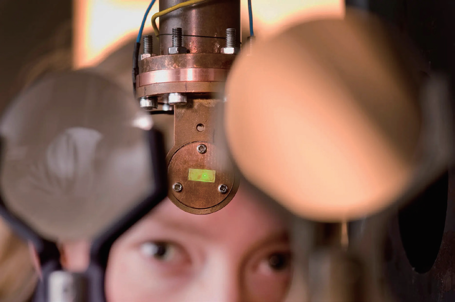 英国曼彻斯特大学光子科学研究所的科研人员正在研究一块涂有氮化镓的工业蓝宝石晶圆碎片