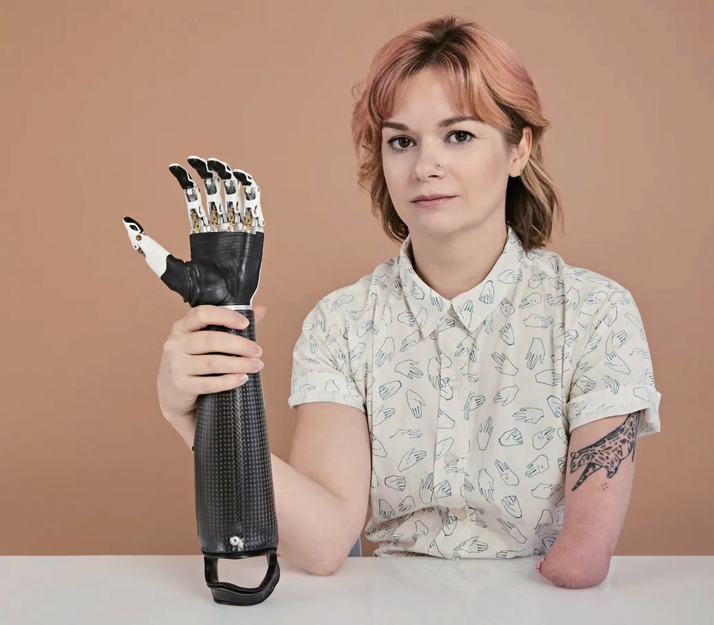 如今,义肢的设计者往往是有良好意图的工程师,而不是截肢者本人。对于这些设计师的高科技、超人类未来的梦想,世间的残肢充当起了展示馆。我知道这点,因为在我的一生中,我曾经被装配过一些市面上最为前沿的义肢装置。我出生时就缺少左前臂,我是美国首批装上肌电义手的婴儿之一。肌电义手这种电动装置由佩戴者的肌肉控制,肌肉的拉紧会被义肢承窝内的传感器感测到。从那时起,我已经装过许多种义手,它们中的每一种都努力实现人手的完美逼真度——有时以美学为代价,有时以功能为代价,但都是旨在模仿和取代缺少的部分。