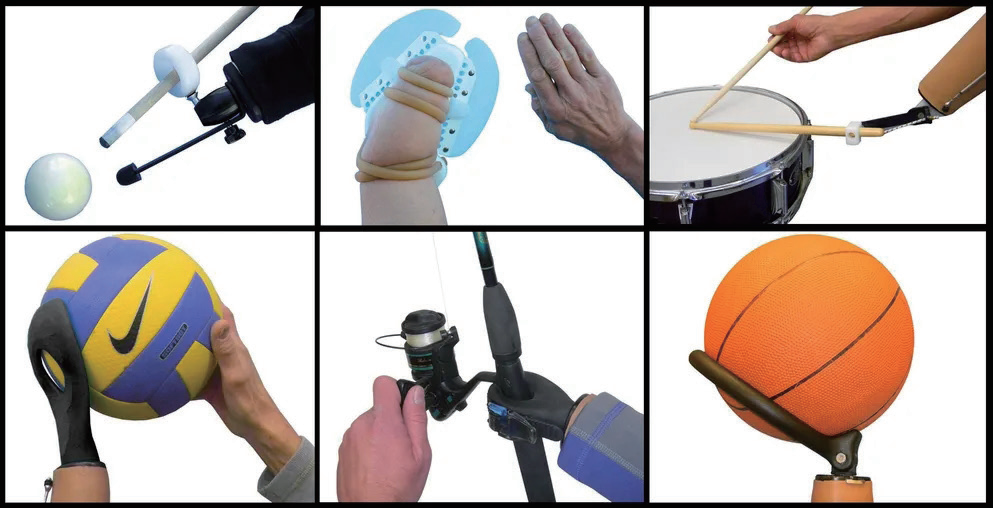 义肢科技公司TRS制造的各种身体动力义肢附加体,用于不同的爱好和体育运动。每个附加体专门用于一个特定任务,可以轻松地更换附加体,用于各种活动