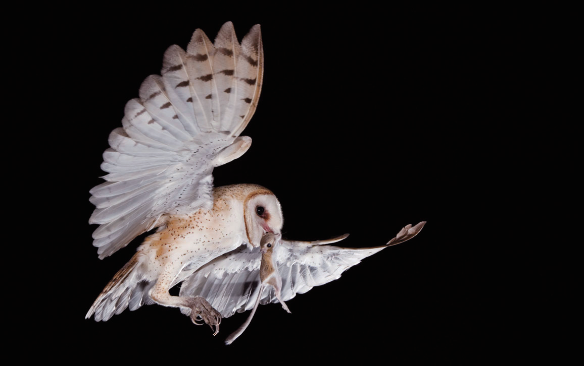 当掠食者(譬如图中的仓鸮)在上空出没时,更格卢鼠会避免在月光明亮的夜晚觅食,因为掠食者能更加容易地发现它们。动物清楚自己的捕食风险,并积极努力地降低捕食风险。对于这些行为变化和带来的级联影响的研究被称为恐惧生态学