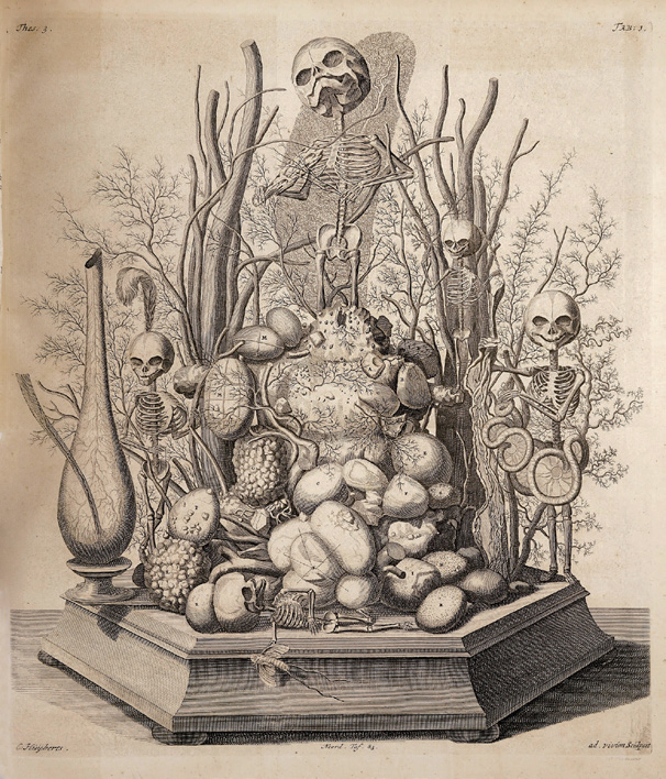 伦敦威康收藏馆?弗雷德里克·鲁谢创作的一件意味深长的立体布景作品,由人类胎儿骸骨、肾结石、膀胱组织以及其他有机体构成。由科尼利厄斯·休伯茨(Cornelius Huijberts)雕刻