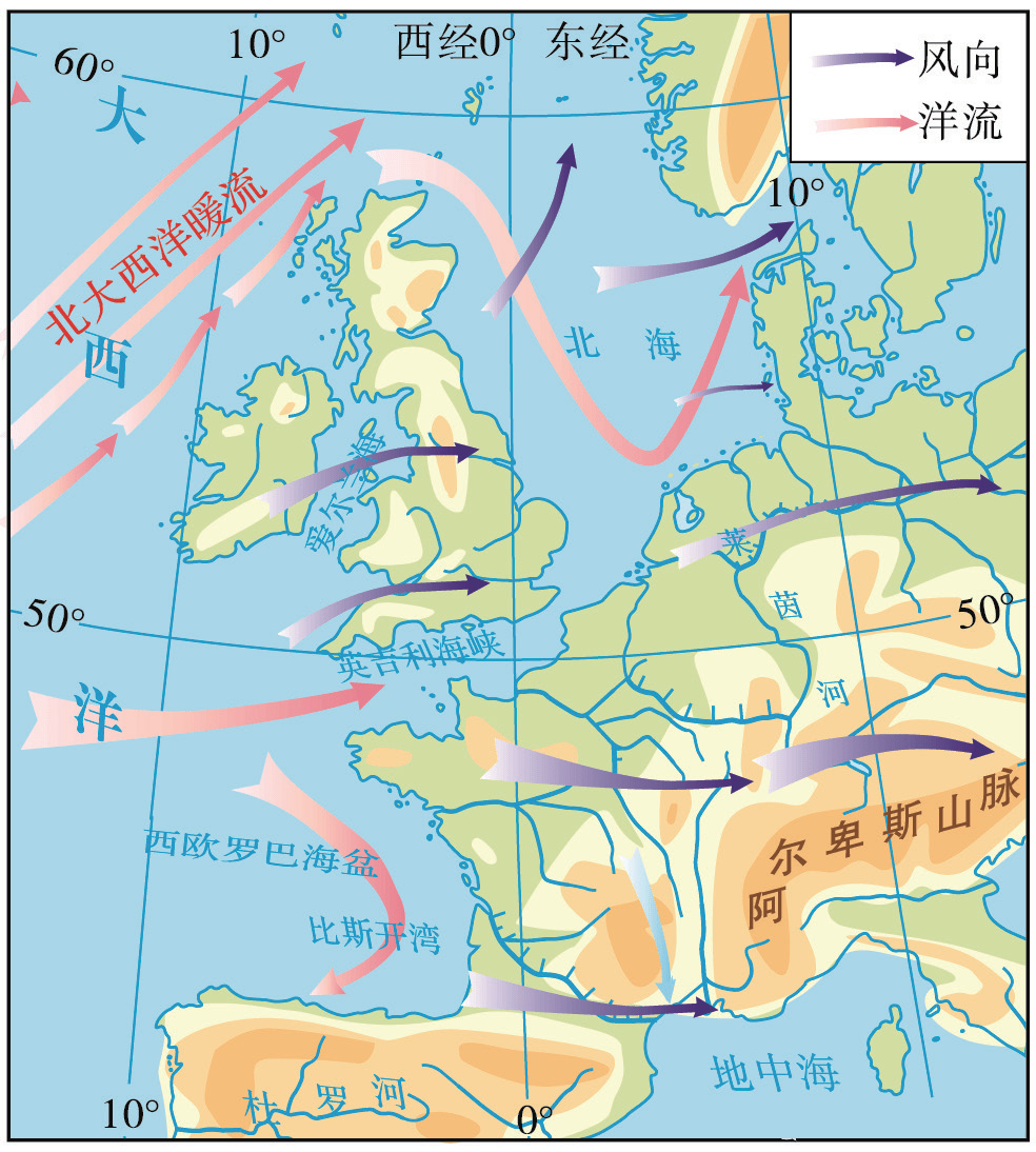 欧洲西部气候成因分析示意图