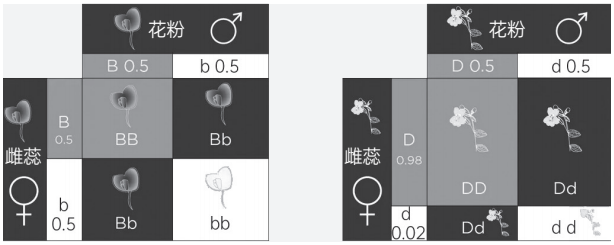 随机分离使得亲本的每个等位基因有着相同的传递概率(0.5的概率)。这能够以传统的庞纳特方格(左图)予以视觉化,这导致后代表现型的3:1比例,后代遗传型的1:2:1比例(分别由灰色、黑色和白色代表)。假如有减数分裂驱动,那些比例就会改变,有时改变很大(右图)。譬如,在混种的沟酸浆中,“失调位点”(D)在种子亲中显示悬殊的98:2分离比偏向,导致后代中DD过多