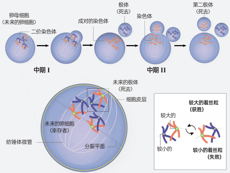 过去8年里,我和同事们使用小鼠来弄清这些动态变化,发现纺锤体的不对称确实是与细胞命运的不对称相结合的。此前的研究已经表明,一种叫作Ran的GTP酶通过GTP结合的激活是由染色体引起的,并会生成一个可扩散的信号,细胞皮层侦测到信号,结果使得细胞极化。另一个GTP酶Cdc42在纺锤体附近极化皮层上富集。2017年,我们表明纺锤体定位、极化触发的Ran信号、来自细胞皮层传回给纺锤体的Cdc42信号三个因素一起导致纺锤体内的不对称。这种纺锤体的不对称是基于微管蛋白翻译后修饰的差异,微管蛋白是构成微管的蛋白质。纺锤体靠近细胞皮层的那一侧有酪氨酸化α-微管蛋白富集,这种α - 微管蛋白含有C端酪氨酸;纺锤体靠近卵细胞的那一侧是去酪氨酸化α-微管蛋白富集,这种α - 微管蛋白的酪氨酸已经被一种肽酶除去。我们在一种杂交小鼠模型(将一个拥有较大着丝粒的品系与一个拥有较小着丝粒的品系杂交)中检验这种不对称的意义。杂交小鼠的雌性减数分裂中,同源染色体相互配对,较大和较小的着丝粒相互竞争,想要传递至卵细胞。我们的研究显示,较大的自私着丝粒利用纺锤体不对称来优先朝向纺锤体的去酪氨酸化的一侧,从而能注定进入卵细胞。