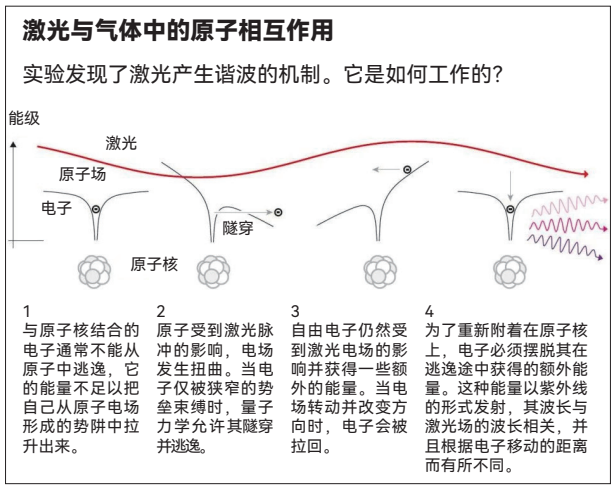 这些光的波依次相互作用。它们的波峰重合时,就会变得更加强烈。当波峰遇到波谷,光的强度就会下降。有时,如果光的波能以正确方式发生相互作用,它们就会产生持续几百阿秒的紫外脉冲。