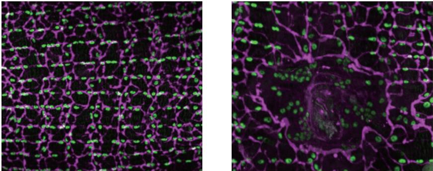 受伤前的果蝇腹部细胞呈现出均一的尺寸,排列整齐(左),但受伤后细胞会融合成具有多个细胞核的巨型细胞(右)