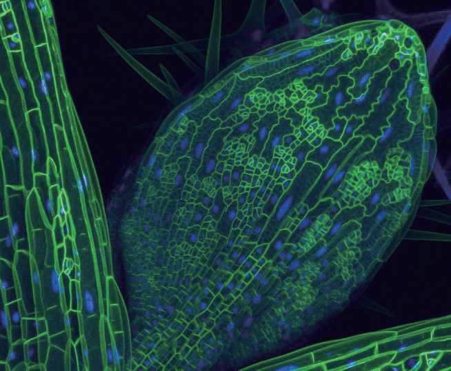 年轻的拟南芥叶,经过操纵产生更多多倍体,许多细胞尺寸增大,并具有更大的细胞核
