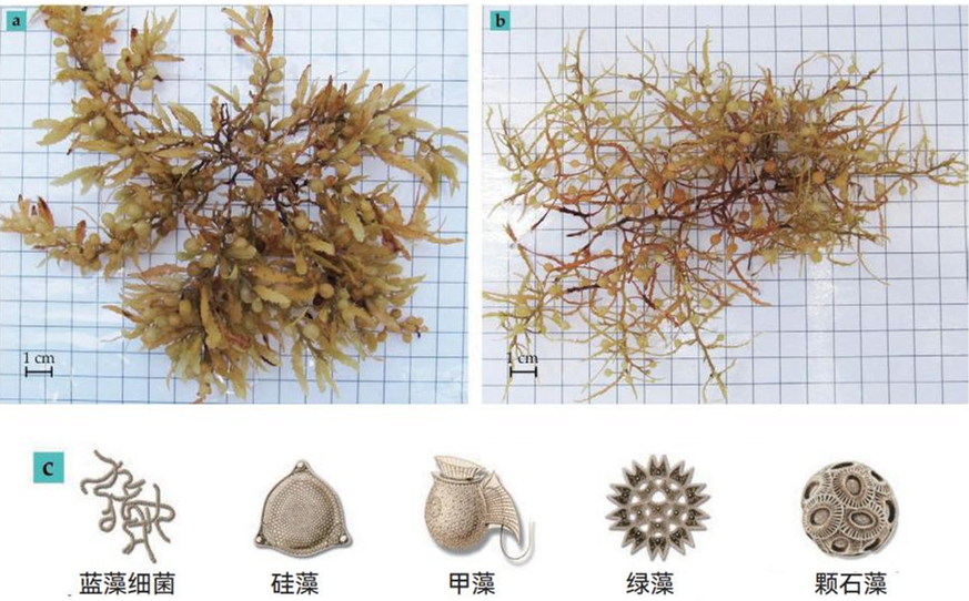 图1图为大型藻类和微藻类。大西洋中存在大量大型藻类流动马尾藻III(a)和漂浮马尾藻I(b)。它们是优质的水生生物栖息地,因为它们的气囊帮助它们漂浮在海洋表面。(c)是海洋和湖泊中常见的微藻类型(它们并不是按比例绘制,大多数的尺寸为数十微米),每种类型可能有数百种物种,它们的形状与图示不同