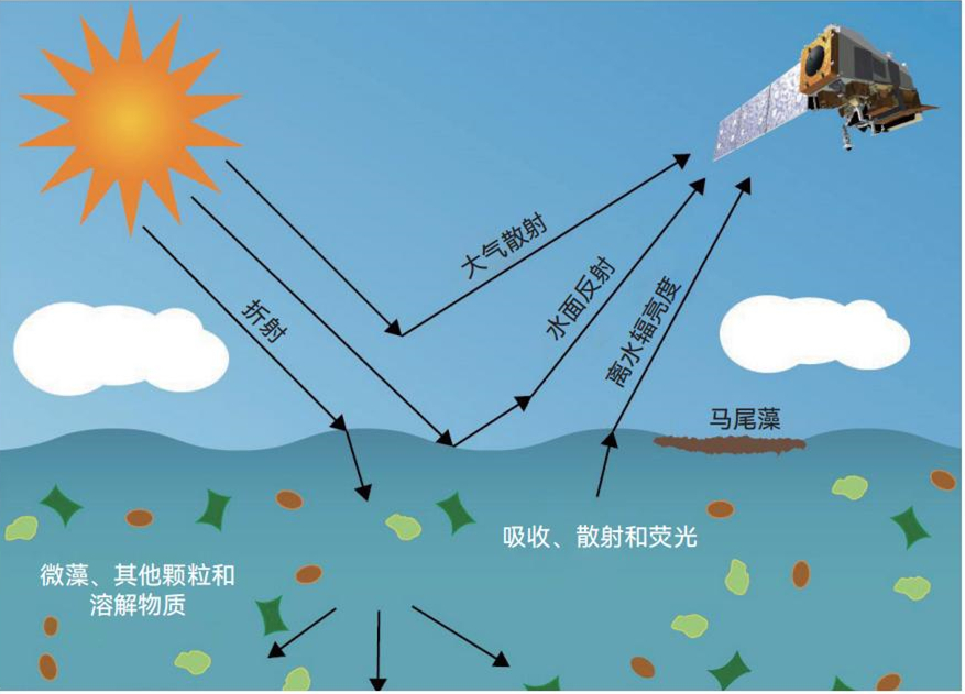 图2阳光在被卫星捕获之前,会与大气、水、颗粒和水中溶解的物质相互作用。在遥感海洋水色的过程中,大气的贡献会被校正,从而产生光谱表面反射率,可用于表征海洋表面和海面下方的微藻和大型藻类