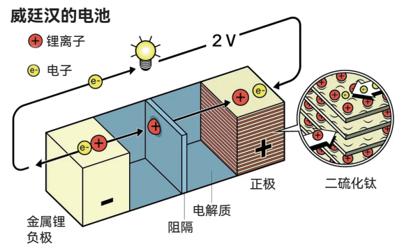 1972年秋天,年轻的英国化学家威廷汉加入位于新泽西州的埃克森研究工程公司。到圣诞节时,他开发出一种以二硫化钛作正极、使用以锂盐为主体的液态电解质、由锂盐提供锂离子实现充放电的电池。