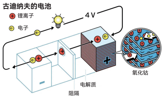 1980年,古迪纳夫和水岛公一改进威廷汉的设计,用氧化锂钴取代二硫化钛作为电池正极