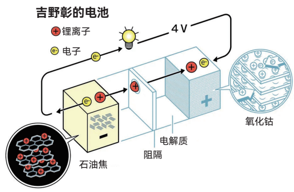 吉野和同事将古迪纳夫设计的正极与塑料以及其他各种材料(大多由不同类型的碳组成)负极配对。最终,他们选择了由石油焦制成的碳基负极。