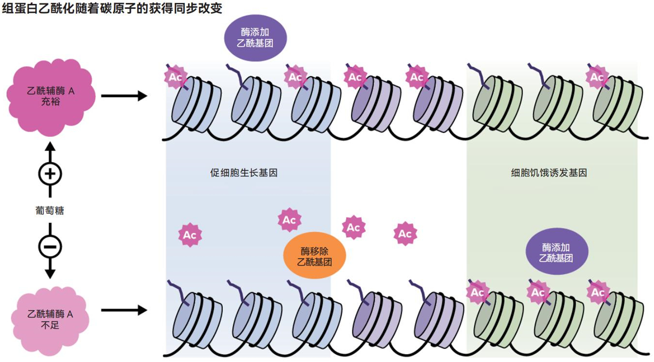 上图描绘了不同细胞条件下乙酰基团的运动模型。当能量充足且线粒体全速运转时,乙酰基团会大量存在并附着在促进细胞生长的基因的组蛋白尾端上。当“食物”变得稀缺时,细胞会通过消耗这些乙酰基团来获取能量。剩余的乙酰基团会重新排列以激活那些与增加细胞中乙酰辅酶A含量有关的基因