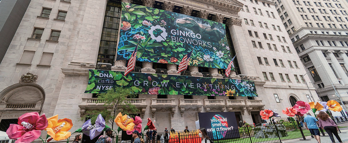 纽约证券交易所的一条横幅庆祝银杏生物公司于2021年公开募股。2024年6月,该公司表示将裁员1/3以上