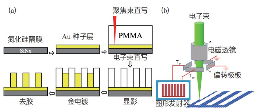 图1 电子束光刻工艺流程(a)和曝光机的单点串写概念图(b)