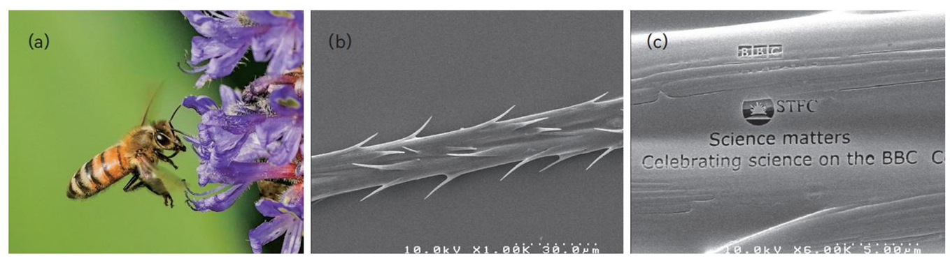 2008年当笔者作为纳米科技首席科学家还在英国卢瑟福阿普尔顿实验室工作期间,收到英国国家广播电台(BBC)牛津频道的邀请:为了庆祝该频道开辟“科学”(Science)栏目10周年,要用电子束光刻技术,将“BBC”“STFC”和“Science Matters”等字样刻写在蜜蜂细毛上以展示先进纳米制造的威力。蜂毛的直径跟人类的头发一样,大致为80~100 微米,如图2(b)。图2(c)是采用电子束在蜂毛上直写纳米尺度文字的扫描电镜照片。这个成功的震撼之处就在于:小就是美!