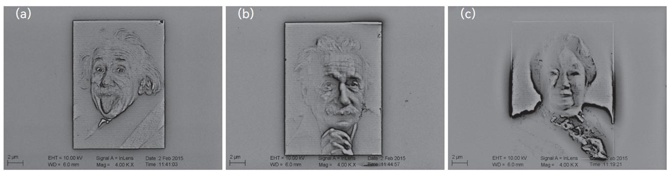 科学巨人的纳米肖像画 利用电子束曝光在光刻胶中不同空间位置的电荷剂量梯度可以实现三维图形,称为电子束灰度光刻。我们可以用电子束这支纤细神笔,按照原图在纳米尺度层面刻画出三维图形。图4展示的是笔者学生运用电子束灰度光刻成功生成的科学巨人纳米肖像画。